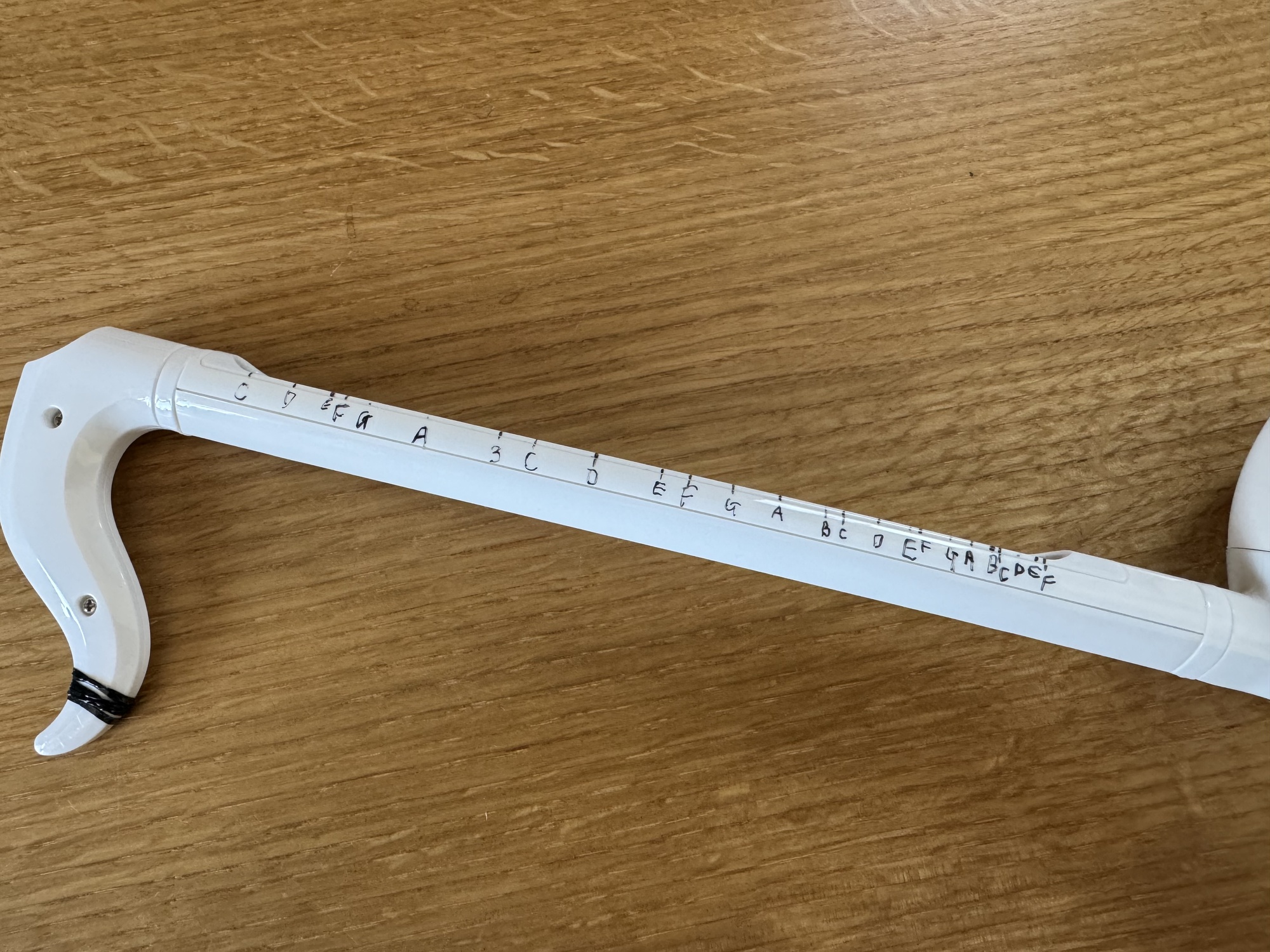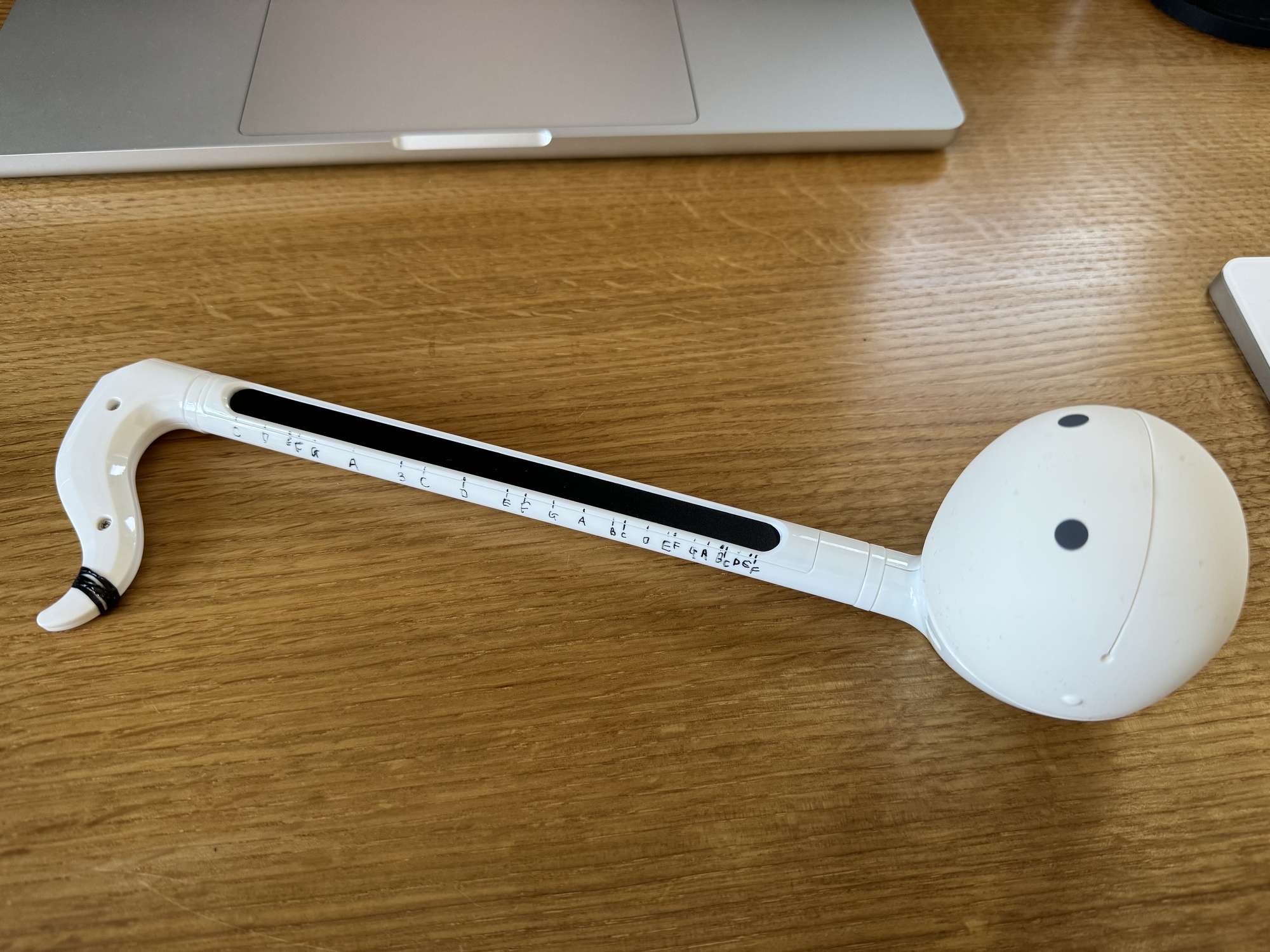 オタマトーンあります 2025年10月1日(水) オタマトーンあります。オタマトーンの特徴は音程がゆるいこと。黒いセンサー部分を触るだけで音が出て、・顔に近づけるほど音が高くなる・しっぽ(?)に近づけるほど音が低くなるという仕組みなのです。ギターの「フレット」のように音程がぴったり決まらないので、ふにゃふにゃした音になります。 音程を書き込んでしまう荒技 演奏が難しいですが、とても面白い楽器です。
